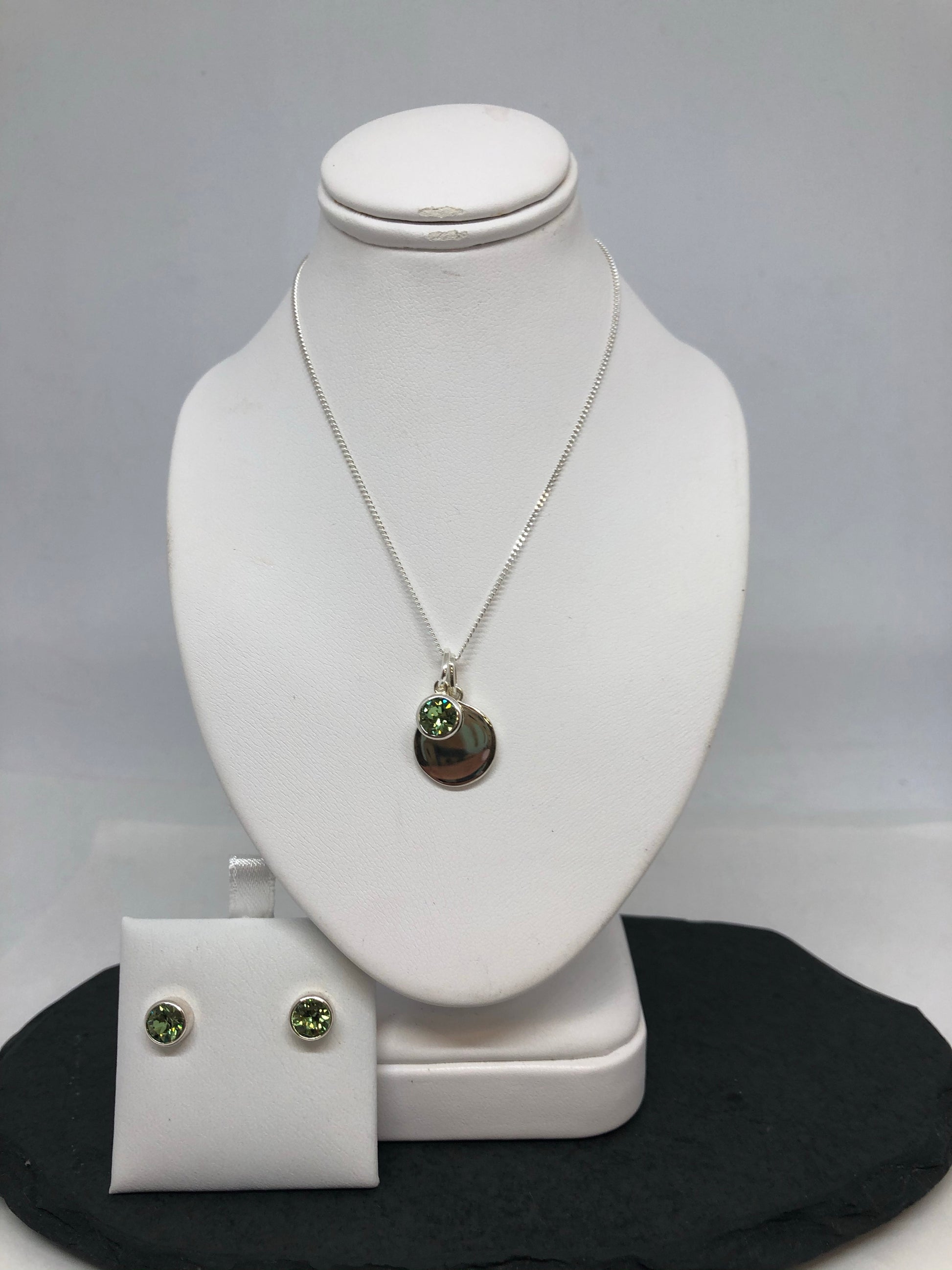 The August birthstone is the beautiful green peridot. Celebrate your birth month with this stunning necklace and earring set in Stirling Silver.