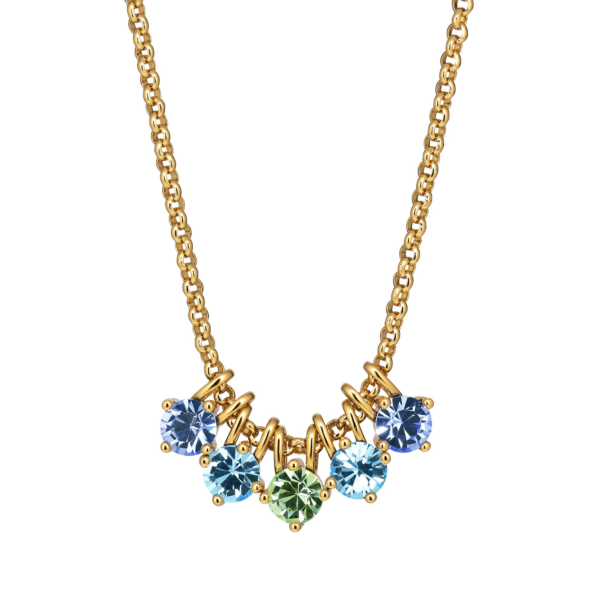PHILA an elegant chain made with five rounded facet cut crystals as pendants. Total length about 42 cm and 5 cm extension. Chain made in stainless steel, pendants in polished brass. Here shown in gold tone finish with aqua blue crystals. Nickel free Danish design.