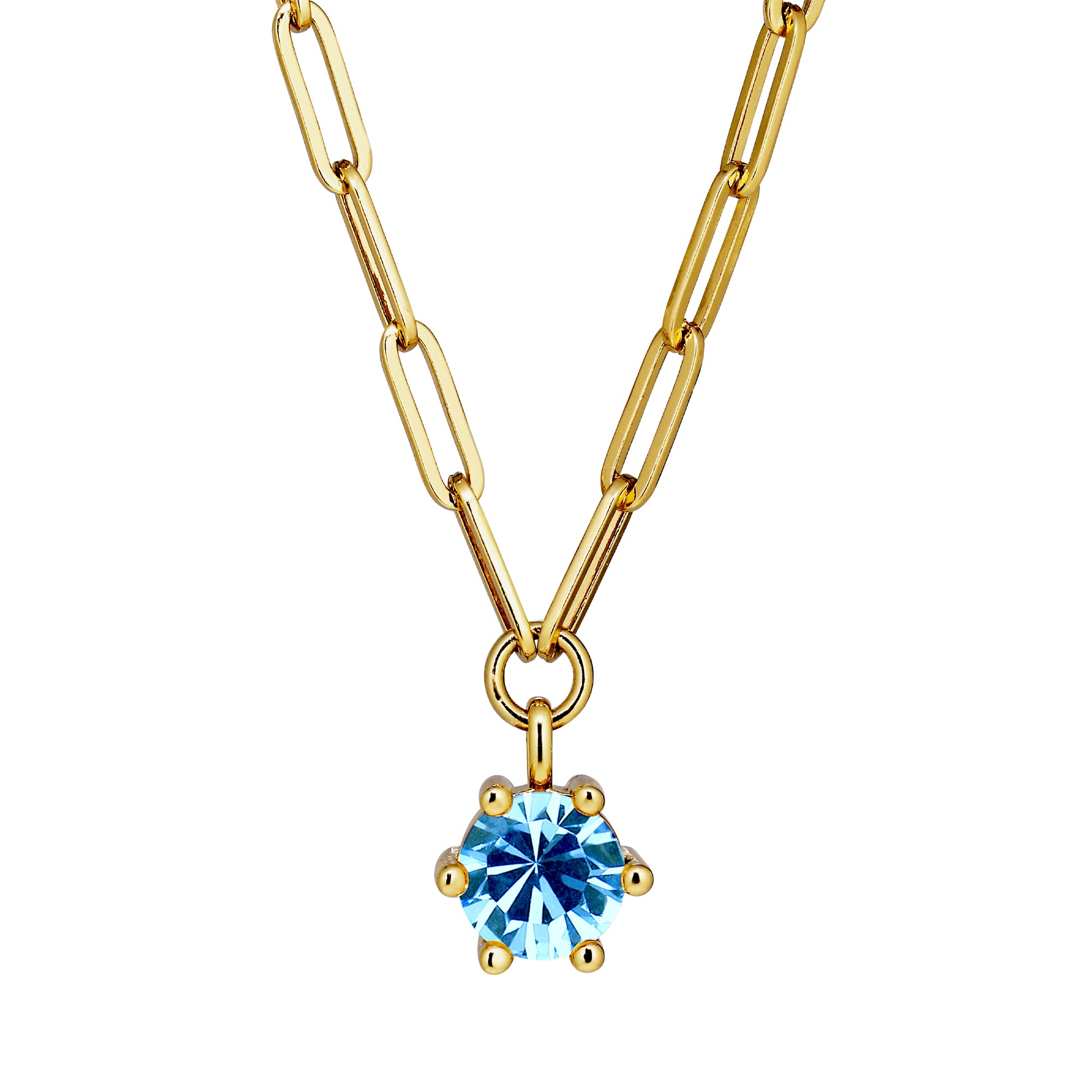 JESSA is a cool and chunky short neck chain made in linked design. The solitaire pendant features a large sparkling facetted aqua blue crystal in a classic prong setting. Chain and pendant made in brass. Here shown in shiny gold tone finish. Total length 42 cm + extension.DANISH DESIGN - free of cadmium, lead and nickel.