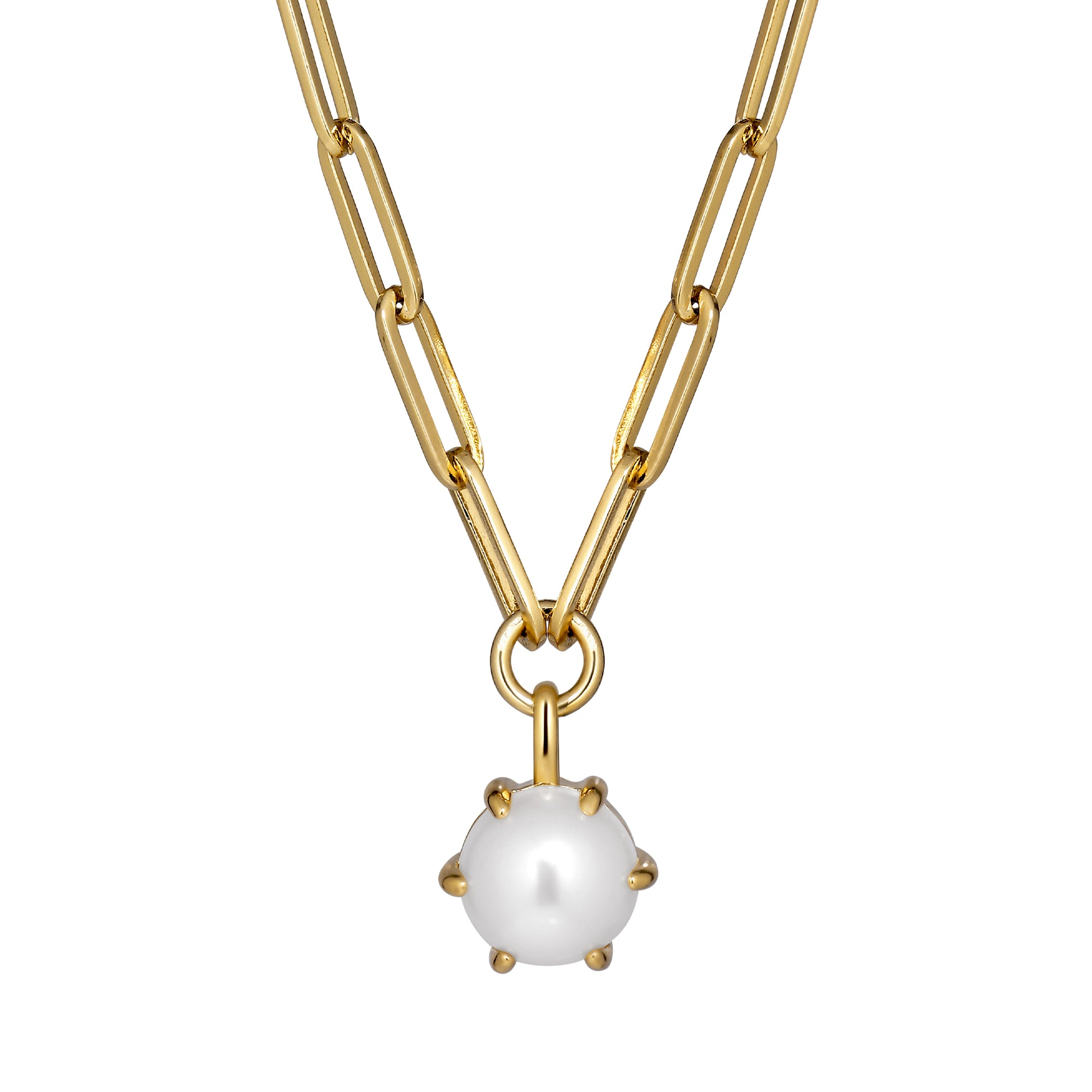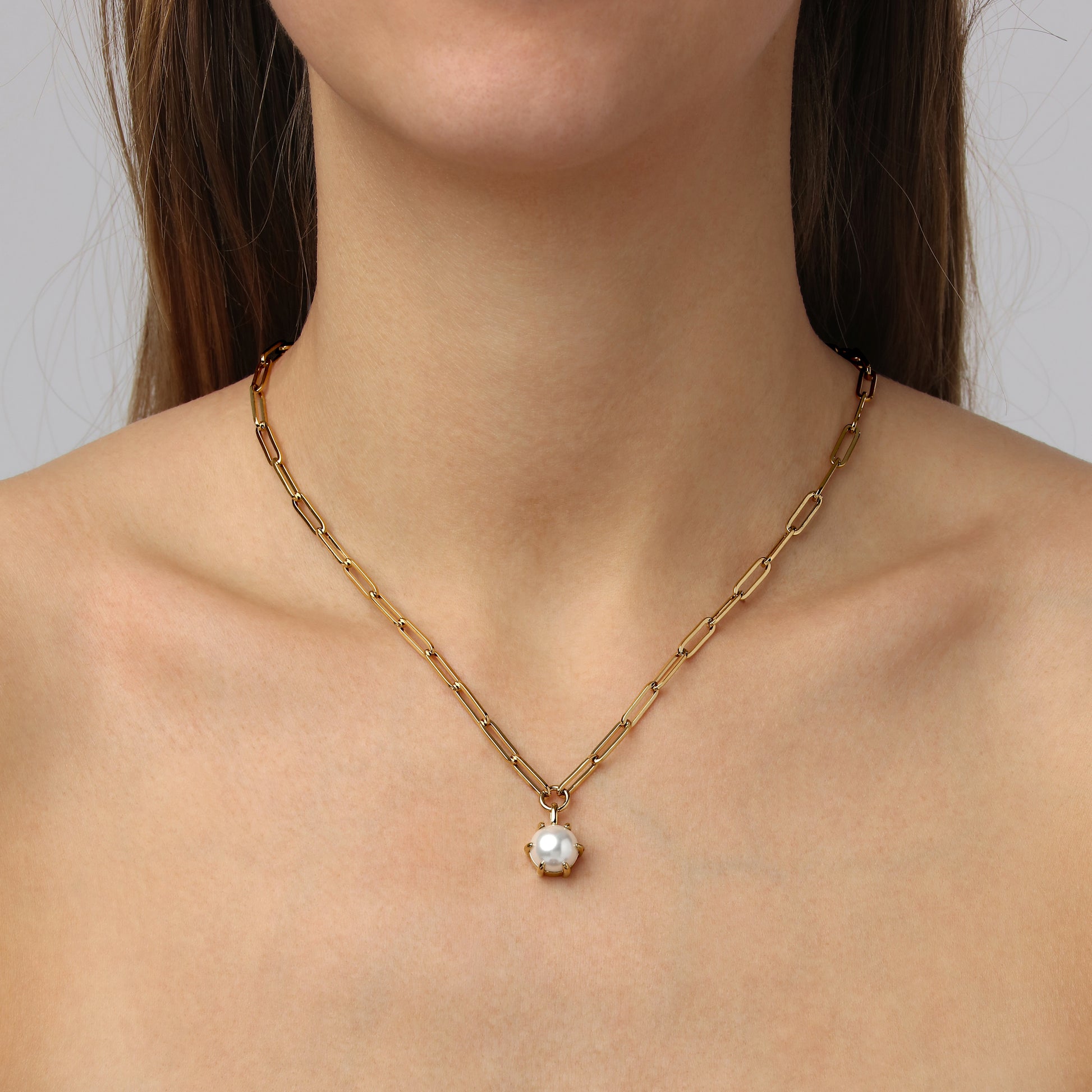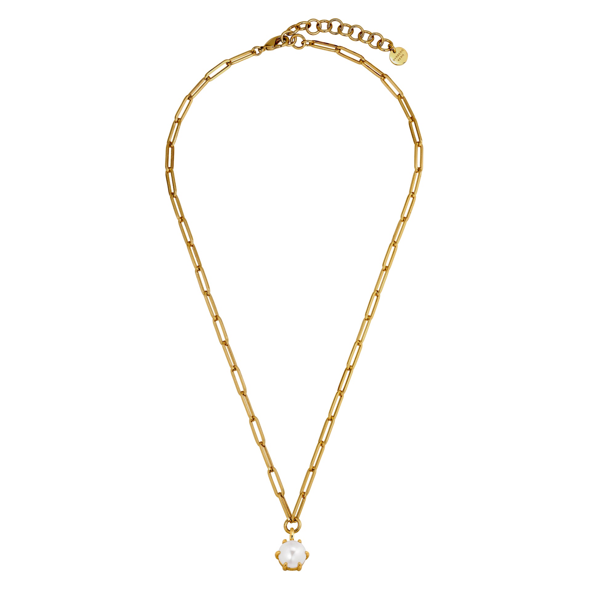 JESSA is a cool and chunky short neck chain made in linked design. The solitaire pendant features a large white imitation pearl ( faux pearl ) in a classic prong setting. Chain and pendant made in brass. Here shown in shiny gold tone finish. Total length 42 cm + extension.DANISH DESIGN - free of cadmium, lead and nickel.